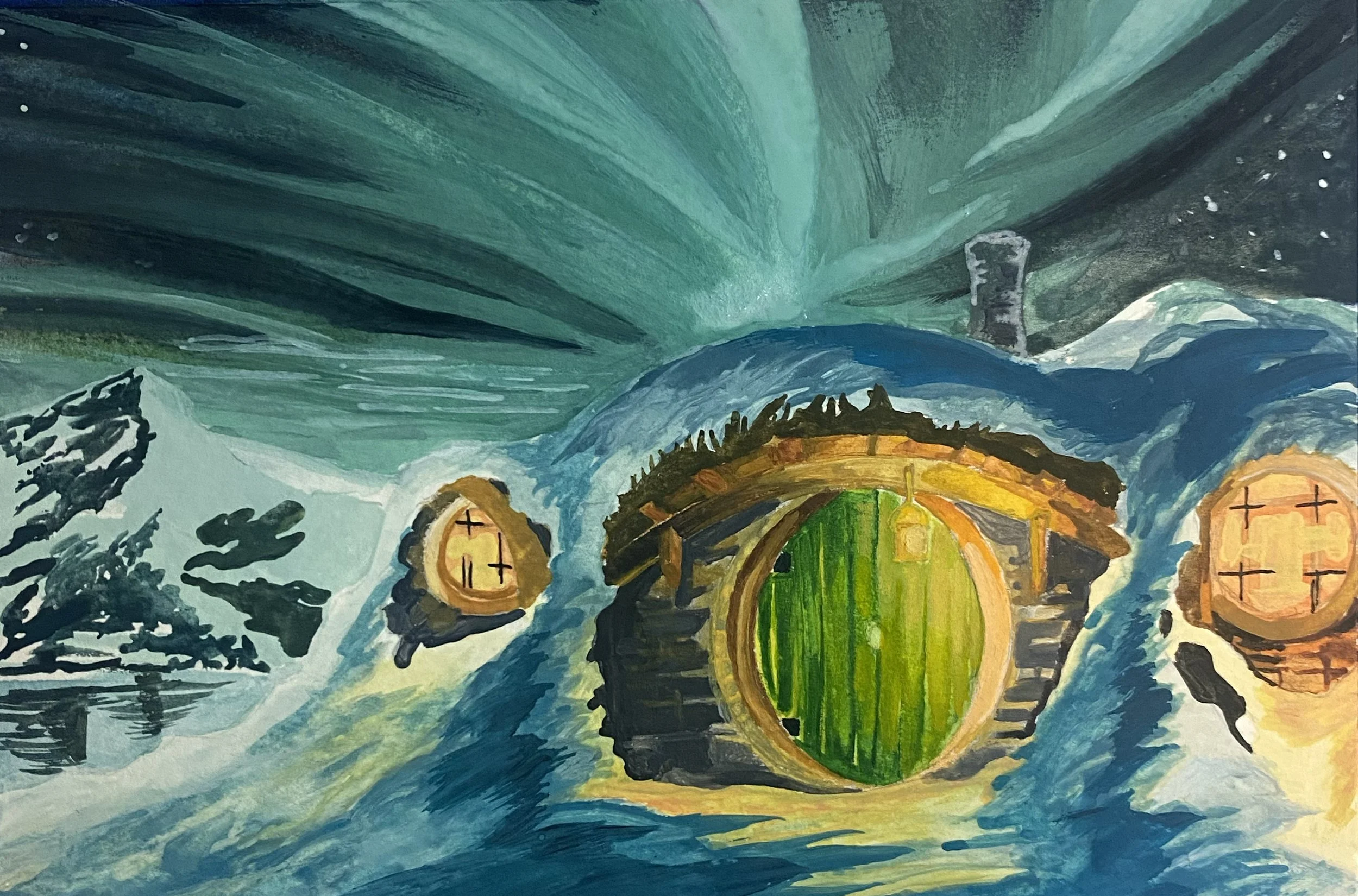 Hobbit Hole w/ Aurura Borealis - Gouache on Paper 7" x 5"